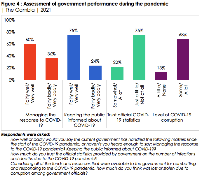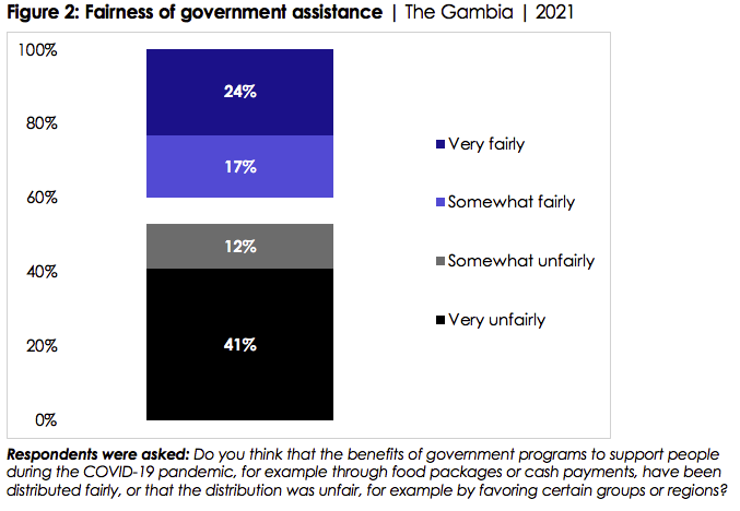 Survey results show that while most Gambian households received government assistance to help them weather the pandemic, more than half think assistance was not distributed fairly, and an even larger majority think COVID-19 resources were lost to government corruption.