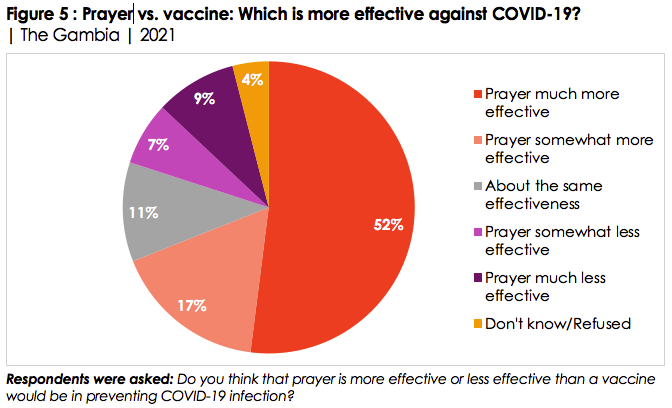 While vaccination roll-out in the Gambia began in February, only two in 10 citizens say they are likely to try to be vaccinated, while most believe that prayer is more effective than a vaccine in preventing COVID-19 infection.