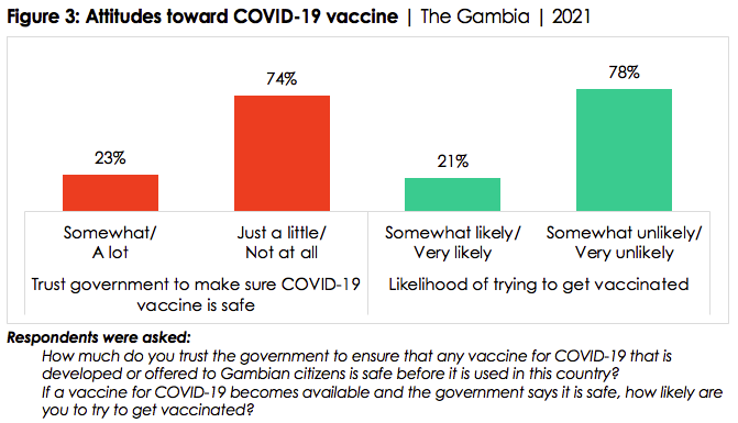 A majority of Gambians approve of the government’s handling of the COVID-19 pandemic, but few trust the government to ensure that vaccines are safe, a new Afrobarometer study shows.