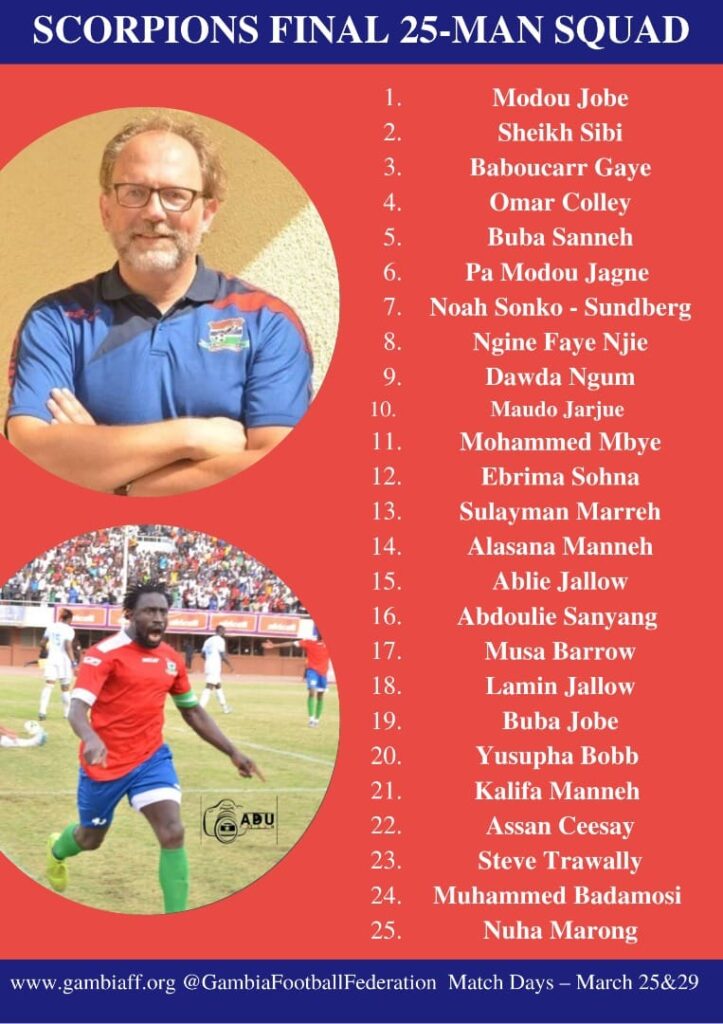 Coach Tom Saintfiet has named a 25-man squad for this month’s crucial CAN qualifiers against Angola in Banjul and DR Congo in Kinshaha. But again, the coach has to battle with public opinion as to why he did not select Ali Sowe, the player who has been scoring frequently for club. The coach is yet to give any public statement about his selection which also excluded Modou Barrow and Sheriff Sinyan who were highly expected to be among the pack. Also there have been strong and passionate objections among fans against the presence of players not active with any club.